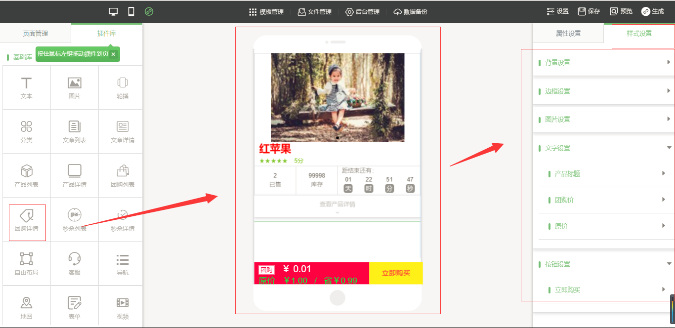 1.点击“后台管理”-“添加产品”-选择“团购”,然后添加产品信息,添加完成之后,点击“保存”,在小程序编辑器中拖入“团购列表”插件。点击选中该插件,在页面的右侧,有“属性设置”和“样式设置”,“属性设置”包括“排序设置”、“显示设置”等、“样式设置”包括“背景设置”、“边框设置”、“文字设置”、“图片设置”、“分割线设置”、“间距设置”,设置完毕后,点击保存,然后新建一个“团购详情”页面,拖入“团购详情”插件,在团购详情中同样也有“属性设置”和“样式设置”,设置完成点击保存,然后返回到“团购列表”中将“链接至”选中团购详情页面,然后点击保存即可,如图所示: